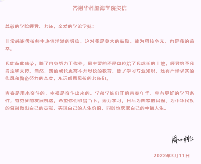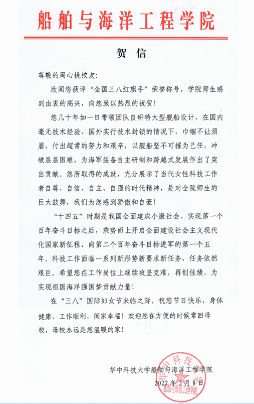 日前,漫岛动漫 向中国船舶701所周心桃校友发去贺信,祝贺其获评“全国三八红旗手”荣誉称号。周心桃校友给母院回信答谢,她表示收到贺信非常激动,这是对自己巨大的鼓励,能为母校争光,是她的荣幸。她对学弟学妹们寄予厚望,希望他们珍惜当下,努力学习,日后为国家的富强、为中华民族的复兴做出自己的贡献,实现自己的人生价值,同时也获取自己的幸福人生。