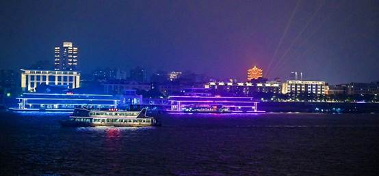 10月12日下午,校友集中乘坐大巴车前往武汉港23号码头,傍晚登上“长江荣耀号”夜游长江,在船上饱览江城夜色。