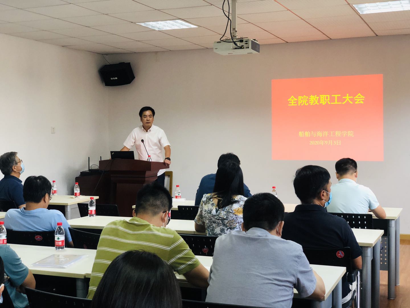 院长解德教授做了名为《敢于竞争 善于转化,为建设一流“船舶与海洋工程”学科而奋斗》的主题报告。他通过对国家、学校以及学院当前所处形势与背景的分析,指出学院下半年的三项主要工作:一是认真做好“双一流”建设成效评价、二是制定学院“十四五”发展规划、三是集中精力参与第五轮学科评估,号召全院教职工实事求是、解放思想、敢于竞争、善于转化,为早日建成一流的船舶与海洋工程学科努力奋斗。