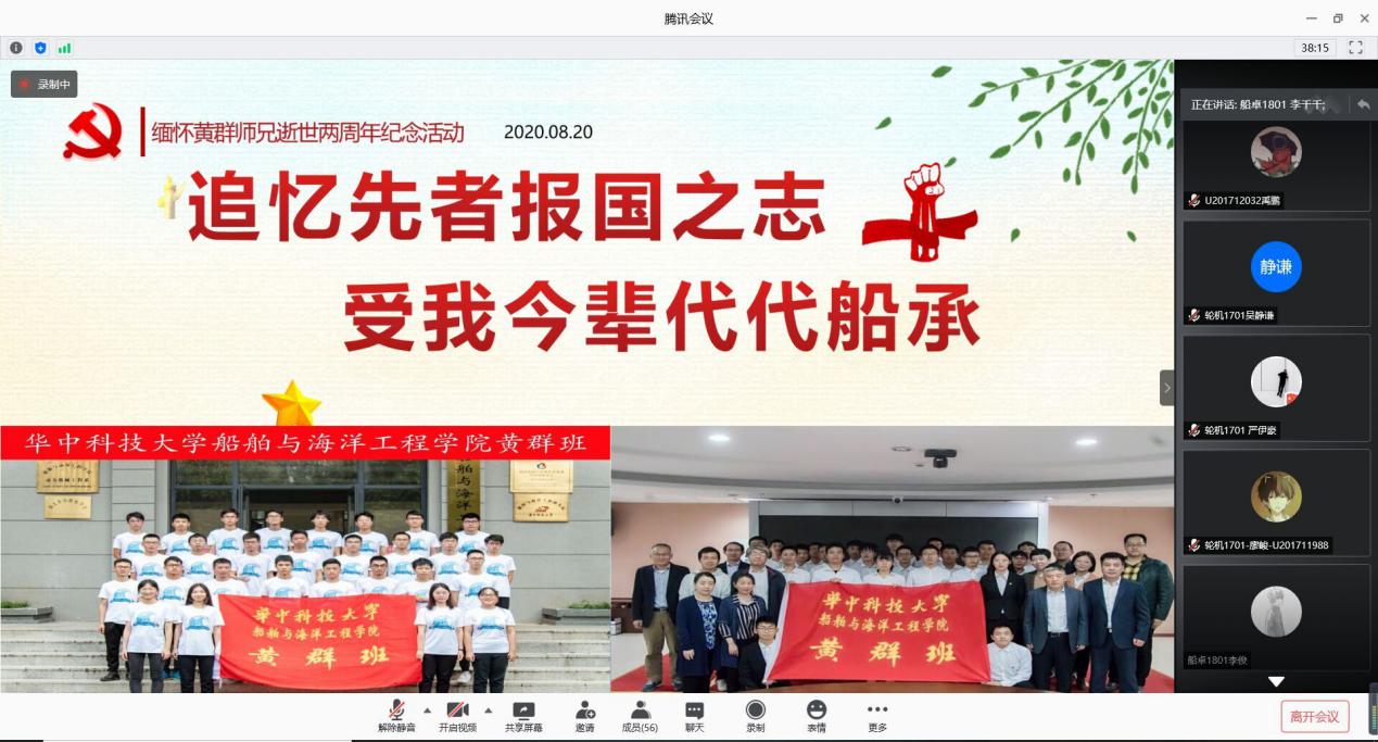 会议上,李千千带领黄群班全体成员回顾了黄群班成立两年来的成长经历和成果,并代表全体成员表达了艰苦奋斗、实现兴船报国梦的坚定信念。班级成员为纪念英雄黄群逝世两周年制作了缅怀视频以表达他们深切的怀念和无尽的思念。