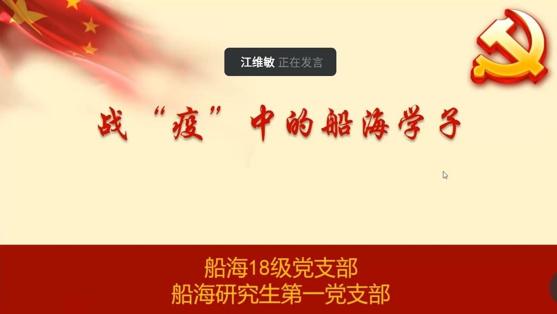 奏国歌后,来自学生支部的7个主讲人围绕“战疫中的党员担当”、“战疫中的国家力量”、“战疫中的命运共同体”、“战疫中的舆情引导”和“战疫中的船海学子”五个主题讲授微党课。