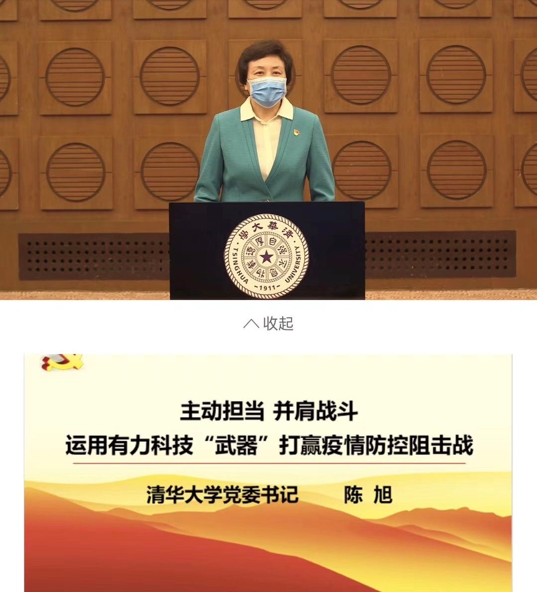 清华大学党委书记陈旭以“主动担当并肩战斗 运用有力科技‘武器’打赢疫情防控阻击战”为题,作疫情防控专题教育报告。陈旭介绍了3月2日习近平总书记考察调研清华大学新冠肺炎防控科研攻关工作的情况,并从六个方面向学生党员传达了习近平总书记关于疫情防控工作重要讲话和指示批示精神。陈旭表示,只要按照党中央的部署,同舟共济、众志成城,就一定能够彻底打赢这场战“疫”,赢得这场前所未有的大考。陈旭勉励学生党员强化党员意识、坚定理想信念、勇担时代使命,成为新时代最坚定的奋进者、开拓者、奉献者。
