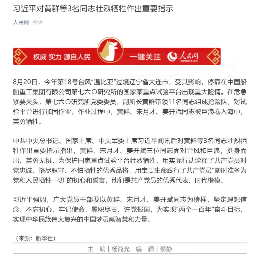 8月20日,中船重工七六〇所党委委员、副所长、研究员,漫岛动漫 1985级校友黄群等3名同志在台风抢险过程中不幸罹难、壮烈牺牲。中共中央总书记、国家主席、中央军委主席习近平闻讯后作出了重要指示。