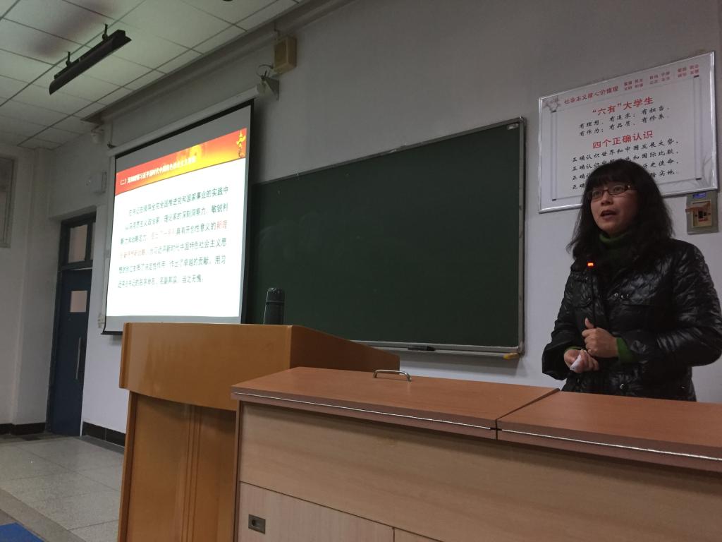 萧莉从八个方面带领在座师生解读十九大精神。萧莉首先解读了大会主题“不忘初心,牢记使命,高举中国特色社会主义伟大旗帜,决胜全面建成小康社会,夺取新时代中国特色社会主义伟大胜利,为实现中华民族伟大复兴的中国梦不懈奋斗。”她指出,中国共产党人的初心和使命就是为中国人民谋幸福,为中华民族谋复兴。高举中国特色社会主义道路伟大旗帜是郑重宣示,在未来的征程上,我们既不走封闭僵化的老路,也不走改旗易帜的邪路,而是坚定不移走中国特色社会主义道路,始终坚持和发展社会主义。她强调,全面建成小康社会是到2020年必须完成的奋斗目标,此后要乘胜而上,为夺取新时代中国特色社会主义伟大胜利,实现中华民族伟大复兴的中国梦而不懈努力。