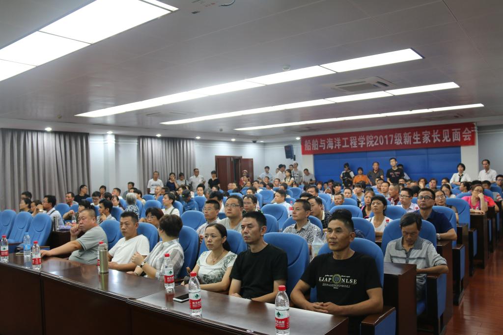 2017级新生家长交流会在武钢联合实验室四楼报告厅召开。出席本次活动的领导和老师有:学院党委书记萧莉老师,院长解德教授,副院长李维嘉教授,副院长程远胜教授,院党委副书记谢宇翔老师,船舶与海洋工程系主任李天匀教授,轮机工程系主任徐国华教授,班主任张正艺和刘加一老师。交流会由2017级辅导员曹金梅老师主持。