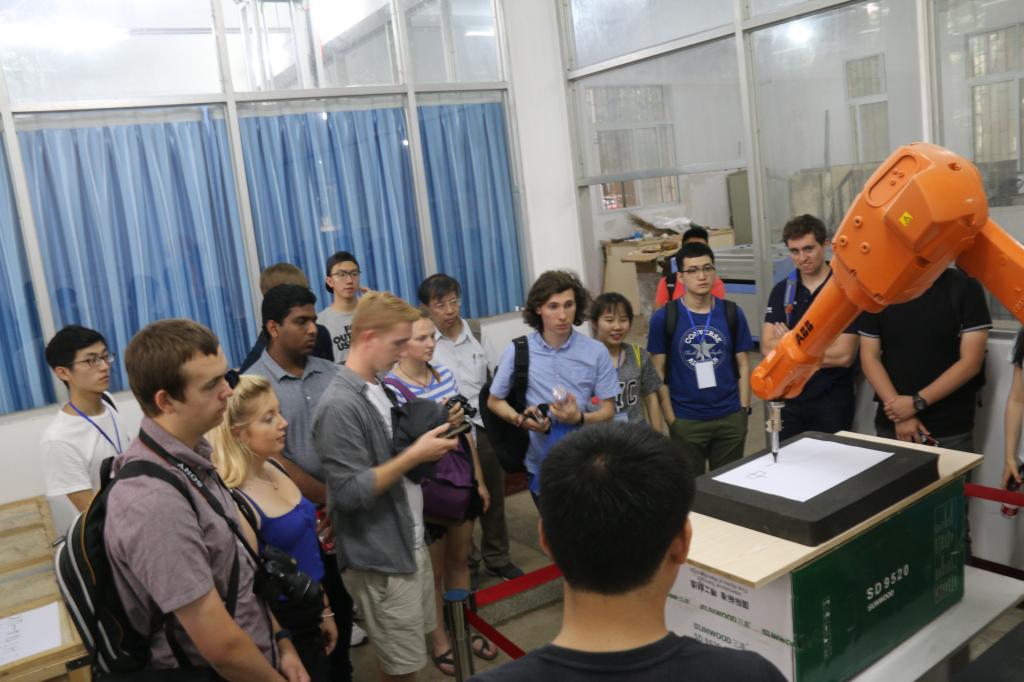 学生控制机械手设备写下“中英交流”的祝词,并现场指导南安普顿大学的同学进行操作。之后,两校师生赶赴国家光电实验室了解了我校在相关方面的科研成果。
