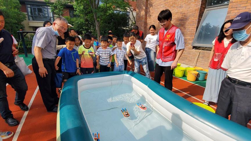 最后志愿者们分组指导孩子们完成建模、分组组装船模。组装完成后在充气水池中进行船模竞速,以加深对所学知识的初步应用。孩子们搭建完成后,50艘航模迫不及待涌入水中,虽然在狭小的水域浅游,却也在孩子们心中的江河中驰骋!