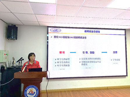 获评2021-2022学年学校“我最喜爱的教师班主任”称号的船海2103班班主任殷彩玉老师做经验交流。她从如何开好班会说起,分享了自己如何通过“倾听、引导鼓励、反思”三个步骤在不同成长阶段有针对性地引导学生成长。