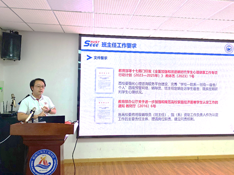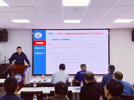 李周密副书记对本科各班学风情况及教师班主任工作要求做详细介绍。他带领与会班主任认真学习了学校与学院的政策文件,对班主任工作职责、工作流程、条件保障进行了详细解读,并分析本科所有班级的目前学风建设和班级发展情况。他要求班主任深入学生群体,压实工作责任,详细了解学生个体和群体情况,真正将育人工作做到学生的身边,做到学生的心里。