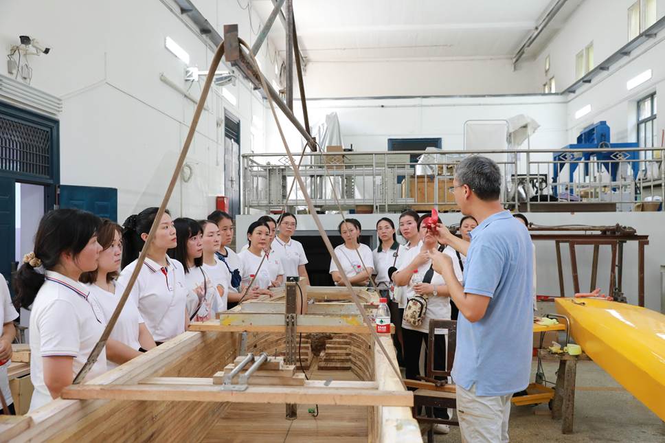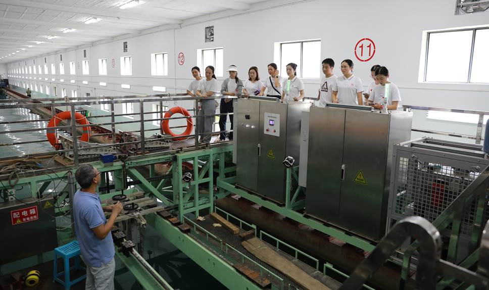 实验中心主任冯大奎教授、宋磊高级工程师带领来宾老师们开展相关活动,活动内容包括船池实验室简介、船舶及线型科普讲解、舰船模型结构分段参观、拖车及波浪演示。