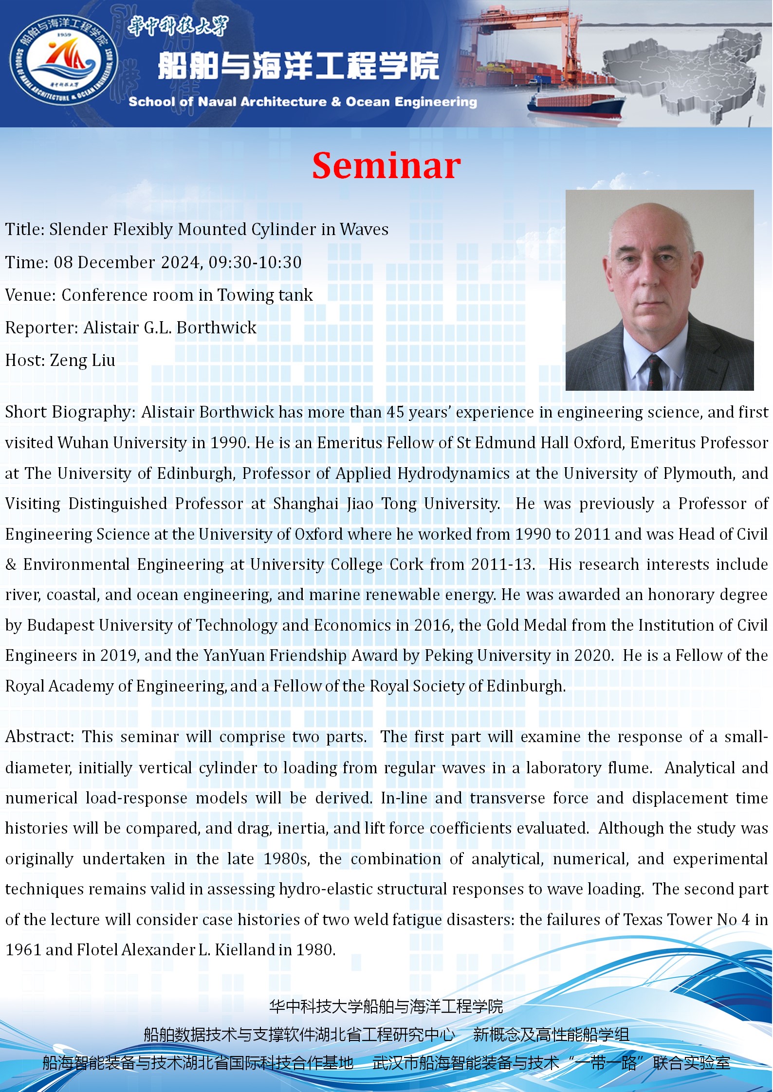 2024年12月8日上午,应刘曾副教授邀请,英国皇家工程院院士、爱丁堡皇家学会院士、爱丁堡大学名誉教授、牛津大学荣退教授Alistair G.L. Borthwick教授到访学院,并在拖曳水池会议室作题为《Slender Flexibly Mounted Cylinder in Waves》的专题讲座。此次活动由刘曾副教授主持,学院师生代表参加交流。