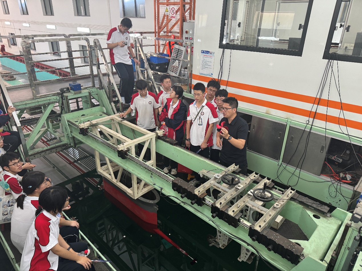 宋磊高级工程师、李阳工程师和杨翔老师带领来宾师生们开展科普研学活动,活动内容包括船池实验室简介、船型及其推进系统简介、螺旋桨敞水试验演示等。