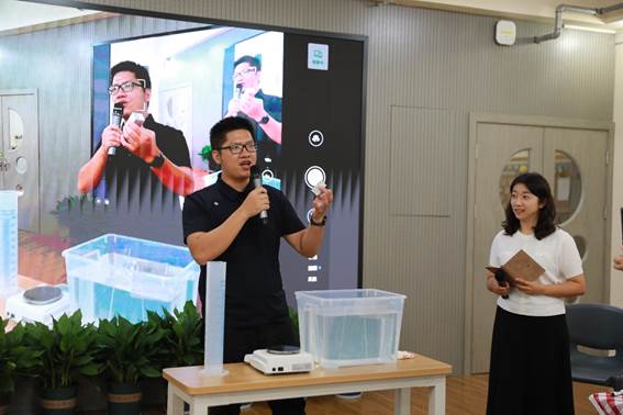 在随后的科普实践环节,宋磊老师针对“巨轮为何能浮,小钉为何会沉”这一经典问题,通过对比两个同重铝块与铝盒的沉浮现象,将抽象的浮力原理化为直观的视觉冲击。他随之揭示现象背后的本质:浮力大小关键取决于物体排开水的体积,而非自身重量。这一精妙的具象化演绎,不仅生动揭示了船舶制造的“空心”智慧,更完成了一次成功的科学启蒙,在幼小的心灵中植入了科学思维的基因。