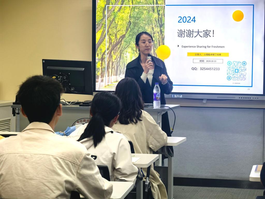 卓越工程师实验班2021班丁尚寒学姐(现已保送至清华大学)就“大一学习生活”进行交流分享。朋风平同学主持讲座,教师班主任李天匀教授、辅导员杨冰老师及班级全体成员参加活动。