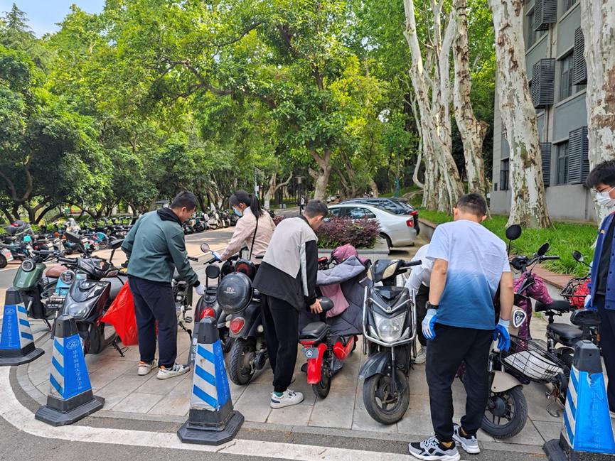 为加强分工合作,同学们分组对东二楼附近的电动车停放区域进行整理,针对电动车违规停放、停放区域垃圾较多、废弃车辆占用停车位置等问题进行了认真处理,通过动动手、出出汗,较好改善了学院周围的停车环境。