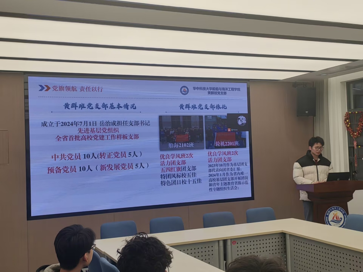 学校先进基层党支部、湖北省首批高校党建工作样板支部“黄群班”党支部从学习黄群精神、践行黄群精神、传播黄群精神和选择成为黄群等四个方面总结了支部过去一年的工作成果,支部书记岳治成坚定理想信念,争做先锋榜样,引领支部成员坚持立心立德、矢志追求卓越。