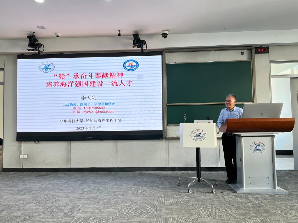 副院长李天匀教授面向2023级本科新生开展了主题为《“船”承奋斗奉献精神 培养海洋强国建设一流人才》的专业教育讲座。